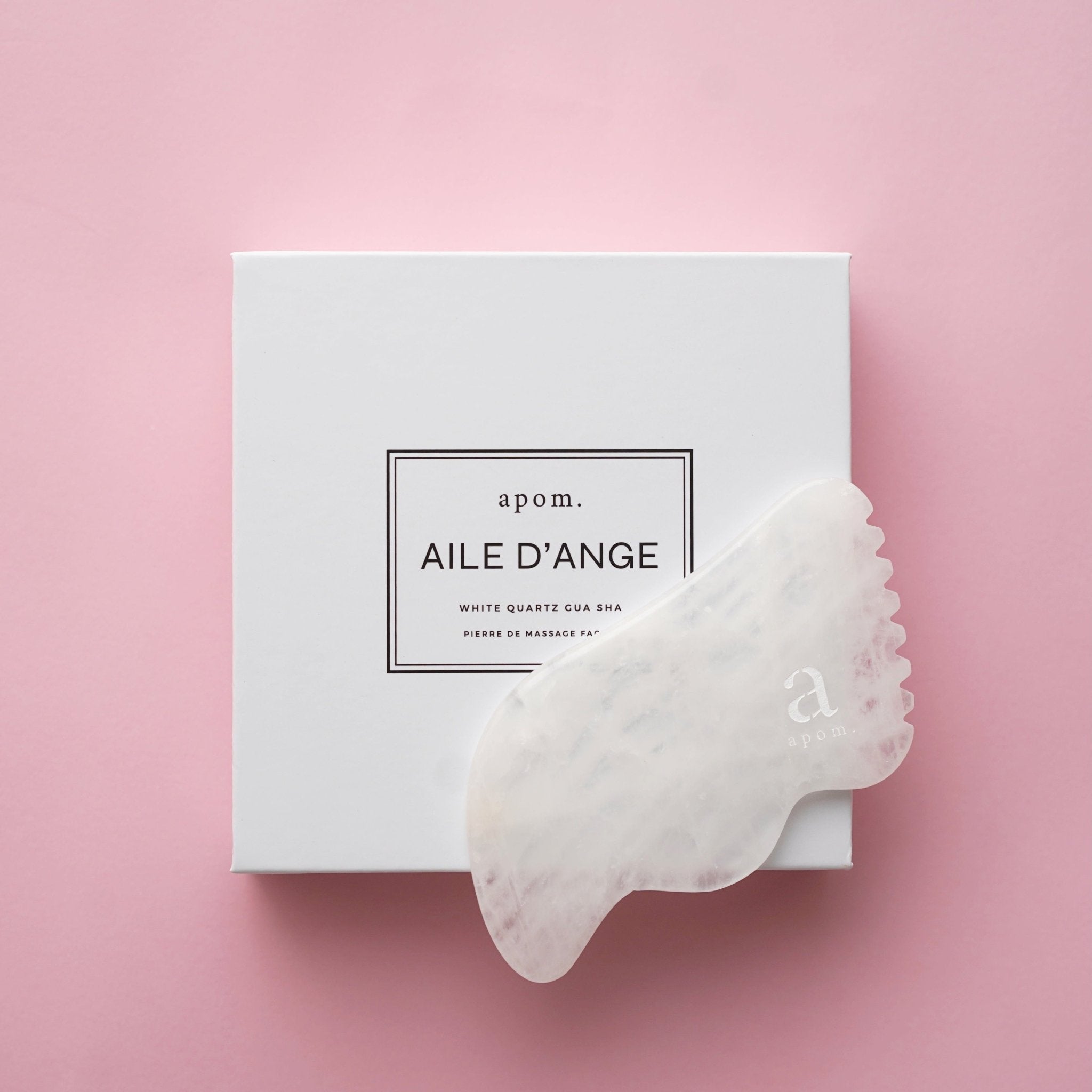 apom. x AU Beauty Bazaar White Jade Gua Sha Facial Massage Tool. This gua sha tool supports lymphatic drainage through gentle massage, promoting circulation to help eliminate toxins, firm the skin, and relax facial muscles. Made from white jade, it aids in rebalancing and decongesting the skin.