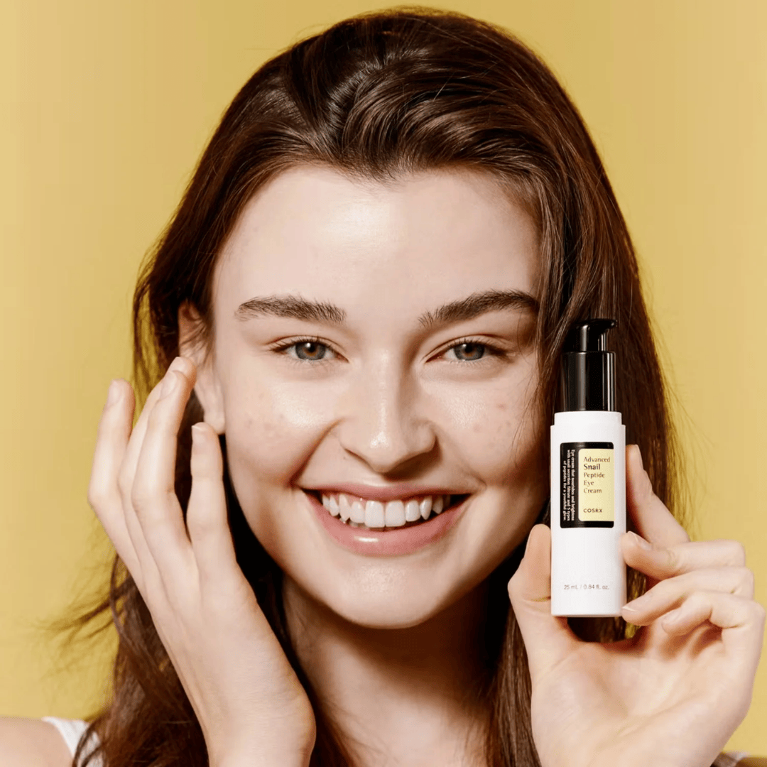 COSRX Advanced Snail Peptide Eye Cream is enriched with 72% snail secretion filtrate and 5 peptides to target fine lines, puffiness, and dark circles while keeping the under-eye hydrated and firm.