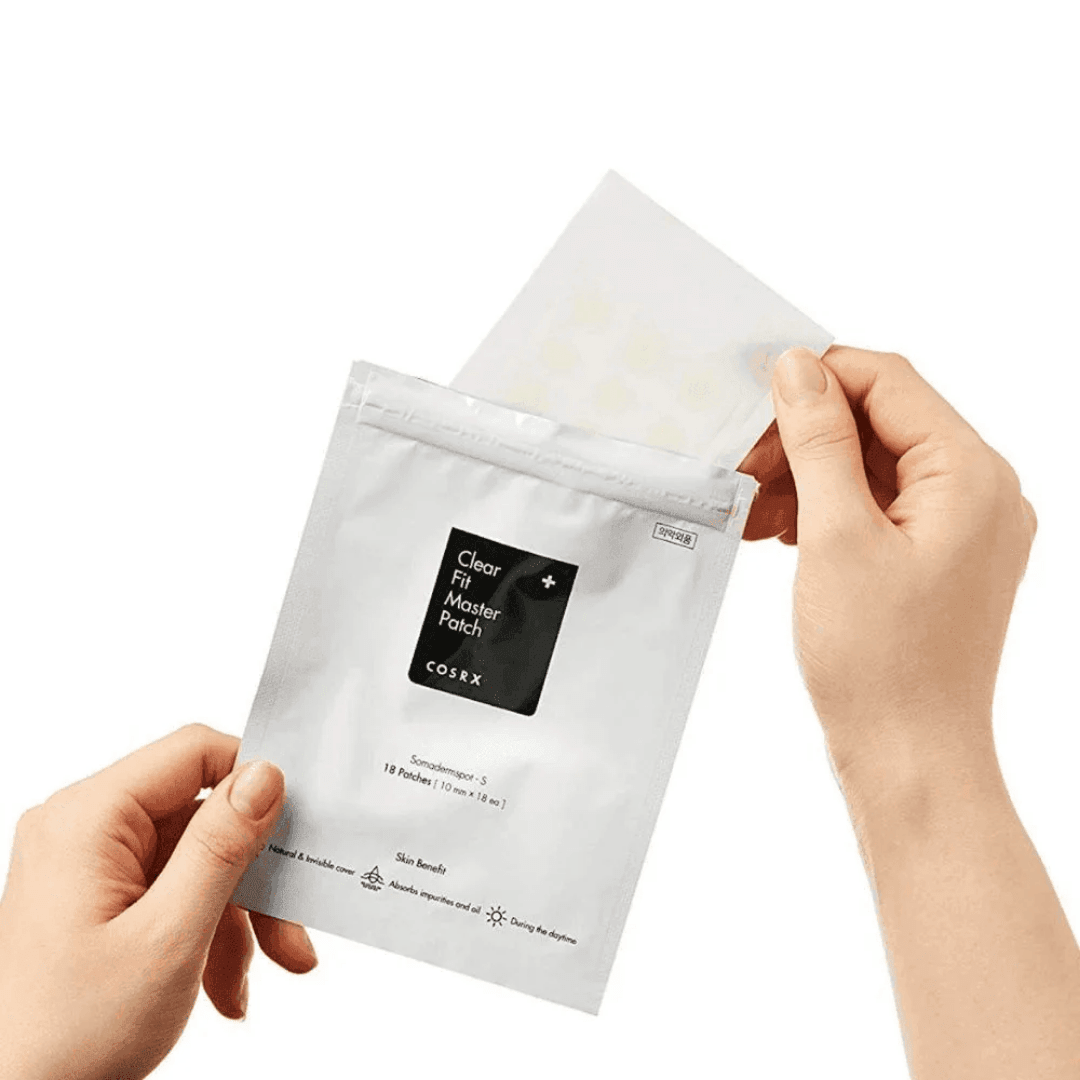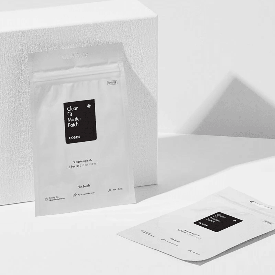 COSRX Clear Fit Master Patch is a thin, clear hydrocolloid patch that heals acne discreetly under makeup or on bare skin.