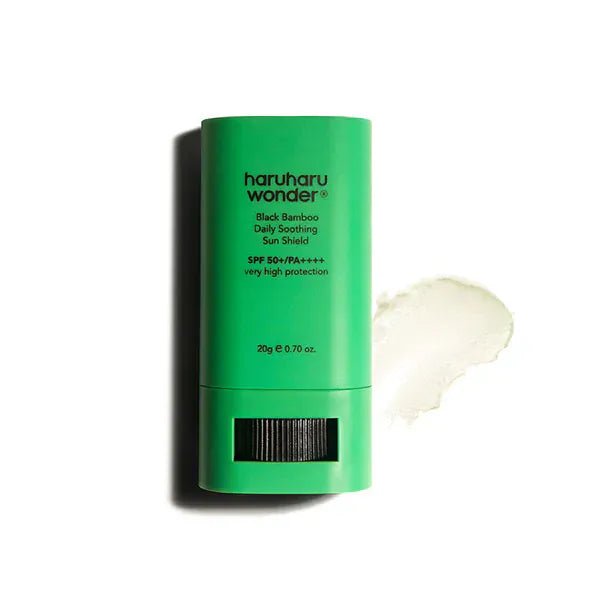 HARUHARU WONDER Black Bamboo Daily Soothing Sun Shield, a convenient stick sunscreen featuring Fermented Bamboo Shoot Extract, Betaine, Niacinamide, and Adenosine. This vegan chemical formula glides on clear with a cooling sensation and sets to a semi-matte finish. Perfect for oily skin types seeking moisturizing sun protection without white cast.