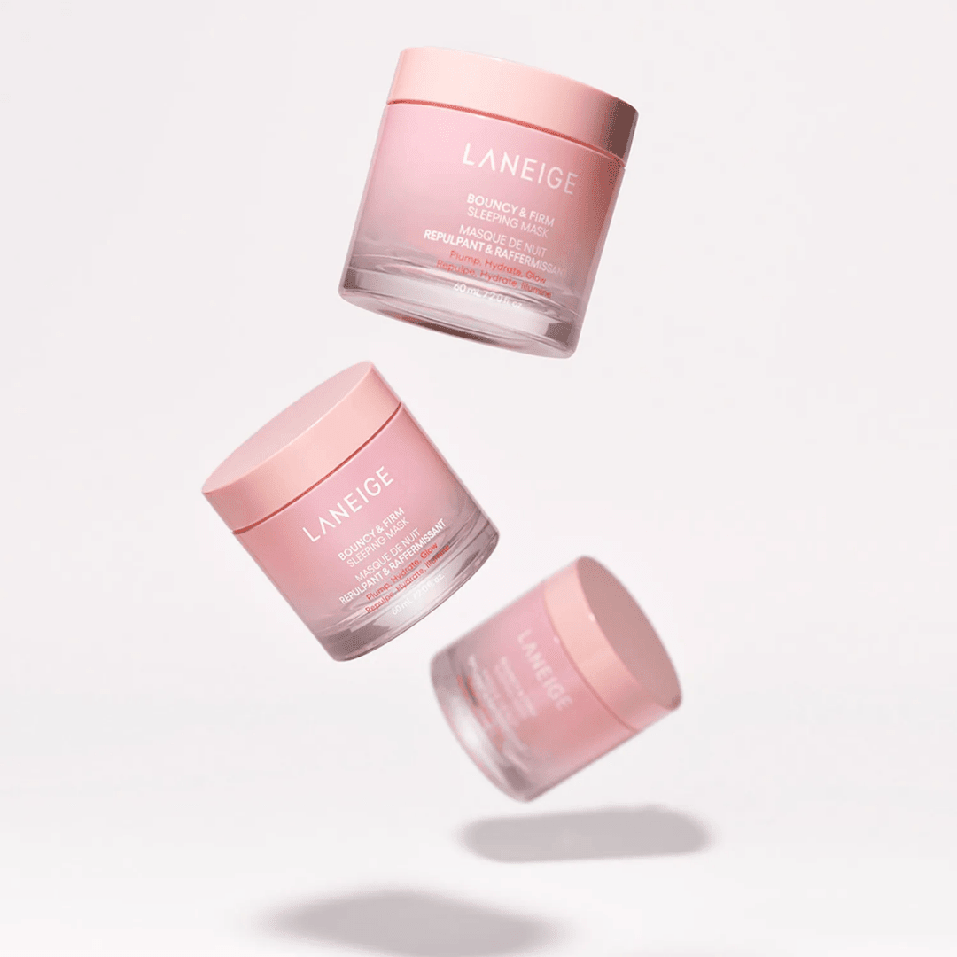 LANEIGE Bouncy & Firm Sleeping Mask, a nighttime treatment mask that revitalizes skin while you sleep. Features Peony-Collagen Complex, Peptide Complex, Hydro-Melt Glow Capsules, and AP Green Tea Lactobacillus to moisturize, firm, and protect against aging. Helps maintain skin elasticity and prevent wrinkles for a bouncy, radiant morning complexion.