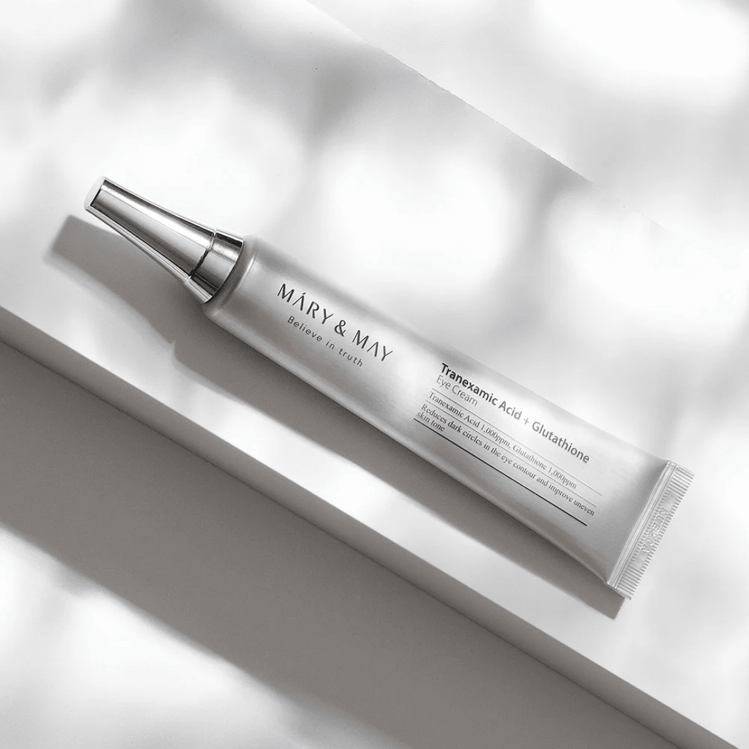 Mary&May Tranexamic Acid + Glutathione Eye Cream is a cruelty-free eye cream enriched with 1,000ppm Tranexamic Acid and Glutathione to improve the look of under-eye dark circles and freckles for a more refined, brighter-looking eye area.