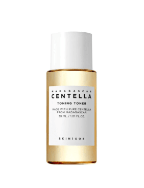 The Skin1004 Madagascar Centella Toning Toner Mini (30ml) is a gentle exfoliating toner that soothes, hydrates, and brightens. It contains 84% Centella Asiatica Extract to calm irritation, PHA (Gluconolactone) for mild exfoliation, Niacinamide & Adenosine for brightening & anti-aging effects, plus Hyaluronic Acid and Betaine for hydration. The lightweight, fragrance-free formula is alcohol-free and is suitable even for sensitive and acne-prone skin.
