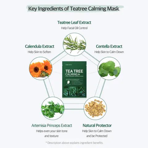 Some By Mi Tea Tree Calming Glow Luminous Ampoule Mask (25g) is a soothing sheet mask drenched in a full ampoule of calming ingredients ideal for oily, acne-prone, or irritated skin. It features Tea Tree Leaf Extract and Centella Asiatica Extract to control excess sebum and reduce irritation, along with Calendula and Mugwort to purify and soften the skin. The mask uses 100% eco-friendly cellulose fabric for excellent adherence and enhanced essence delivery.