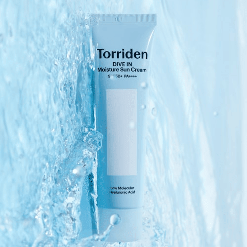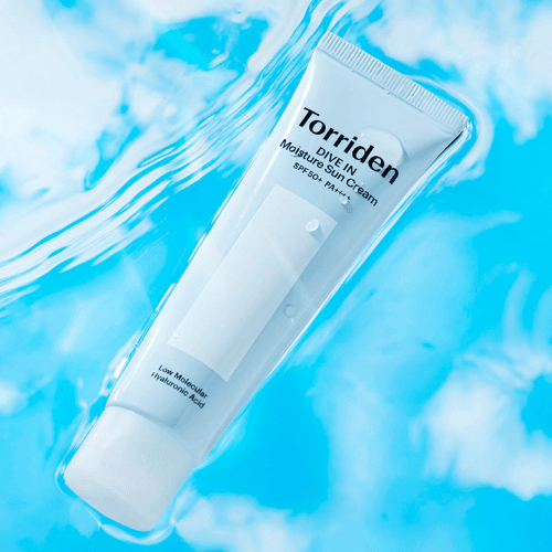 Torriden DIVE-IN Watery Moisture Sun Cream is an organic sun cream featuring Hyaluronic Acid to defend against UV rays and leaves a hydrating finish.